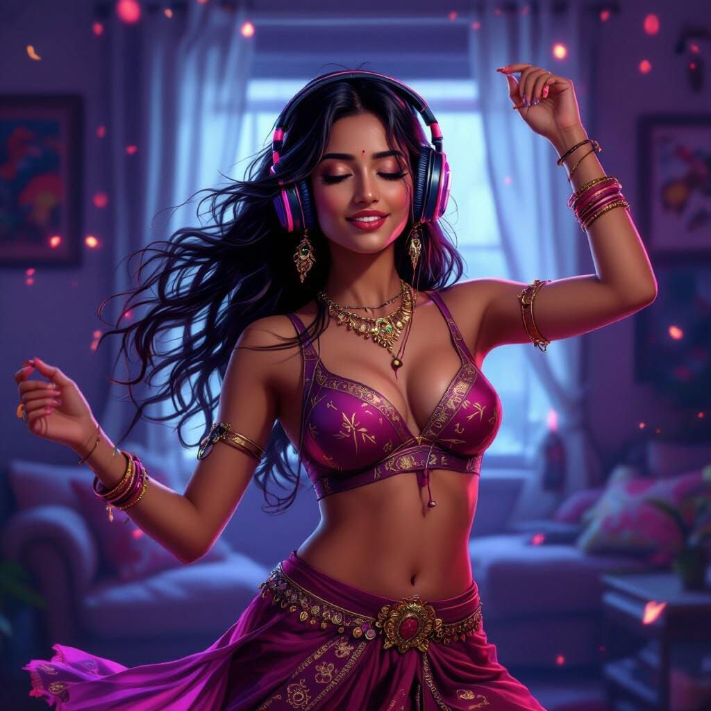 This image shows a beautiful South Asian woman dancing in a room while wearing headphones. The image is a detailed matte painting with deep colors and intricate details, in a fantasy concept art style.