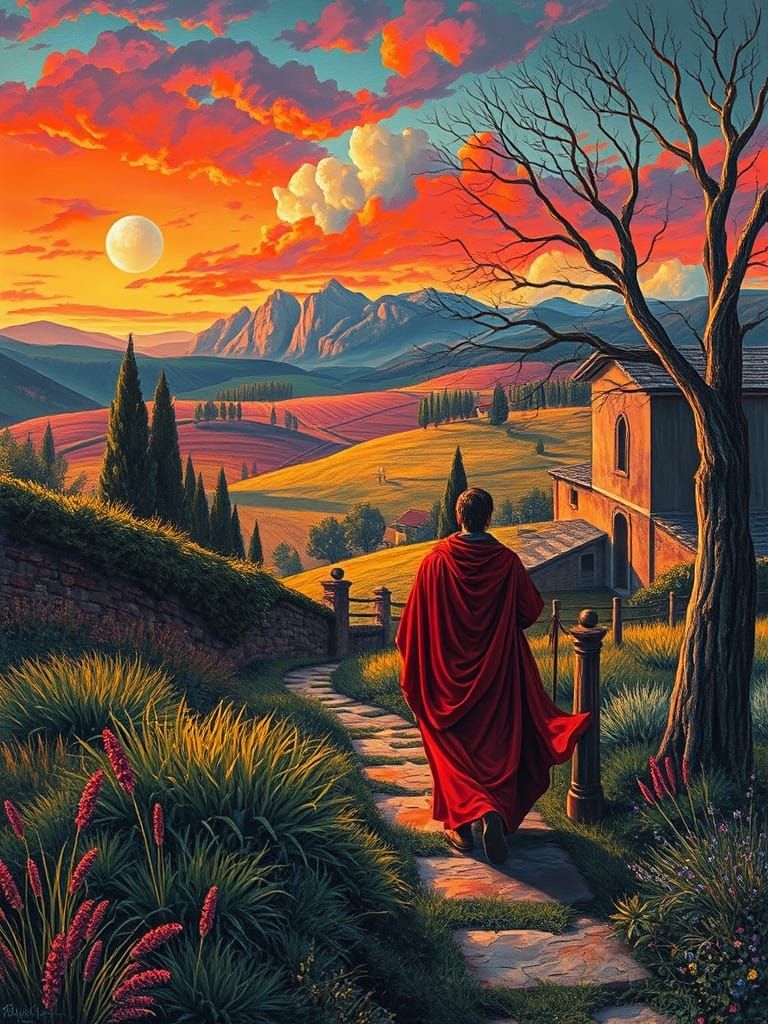 This image shows a Renaissance pastoral scene rendered with thick impasto oil strokes and vivid synthwave colors. The artwork evokes a dreamy, romantic atmosphere with textures inspired by cuneiform.