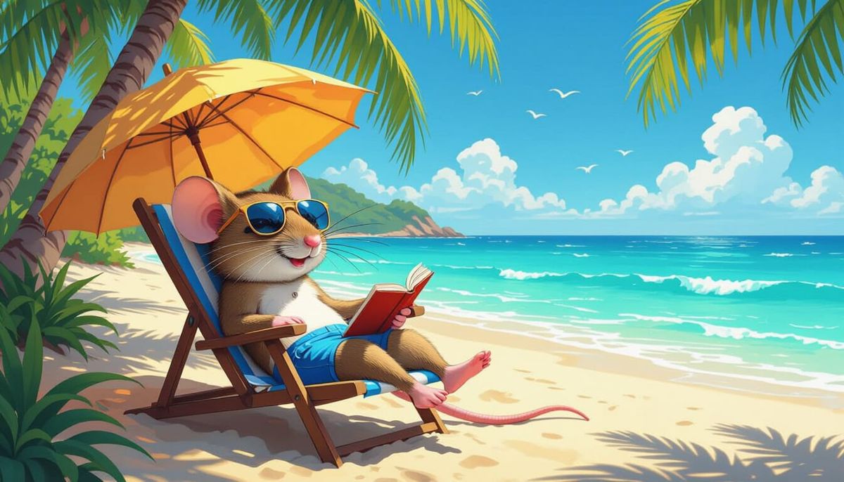 This image shows a cute mouse in blue shorts and sunglasses lounging on a beach chair with a book, shaded by a parasol. Palm trees and a turquoise ocean complete this idyllic scene, rendered in an oil ink style.
