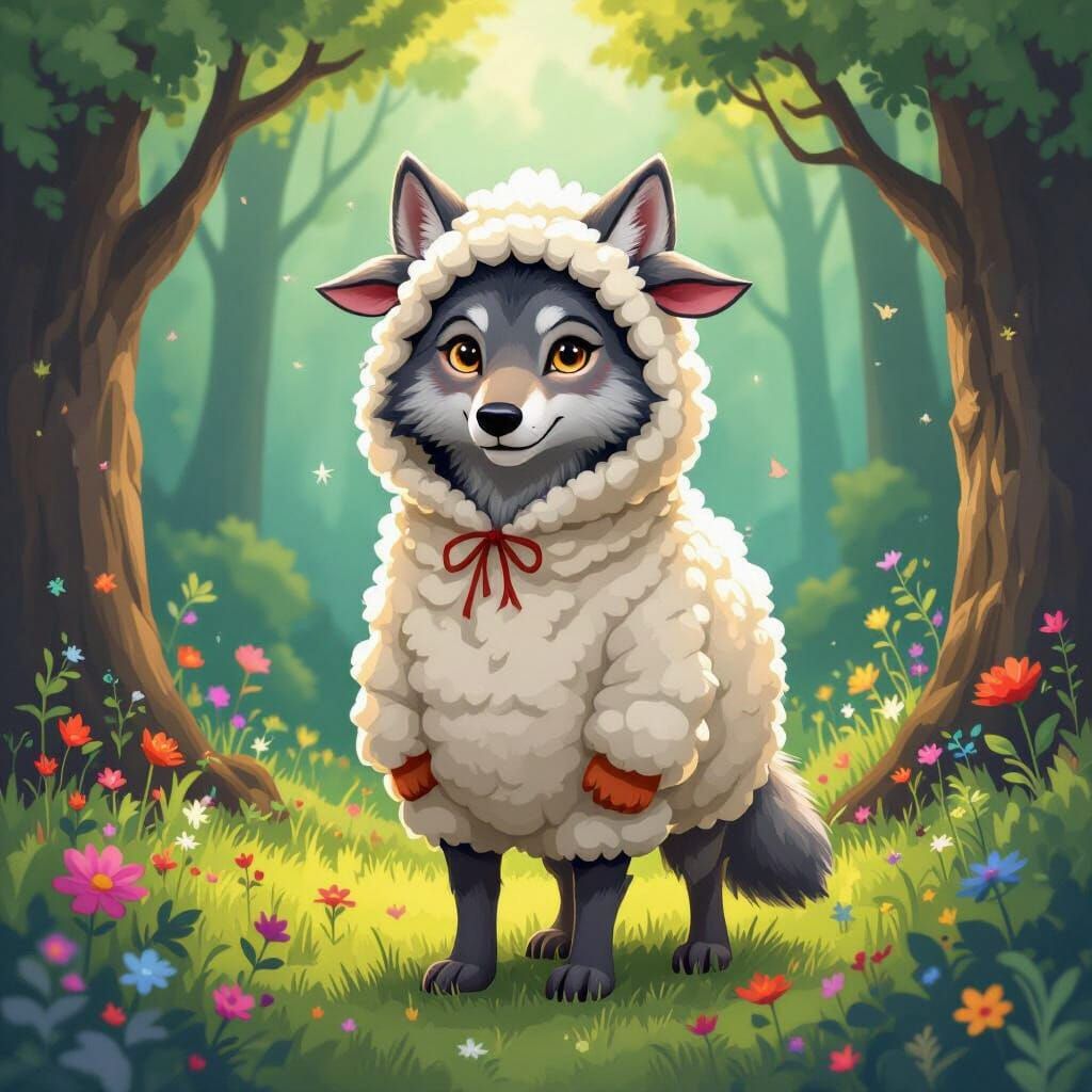 This image shows a wolf cleverly disguised in a sheep costume, standing in a whimsical forest. The illustration features vibrant colors, intricate textures, and patterns, in the style of modern surrealist art.