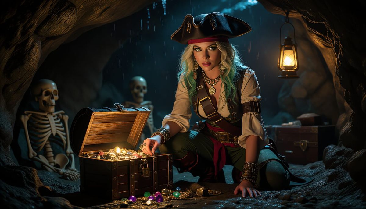 This image shows a woman pirate discovering treasure in an underground cave. Skeletons surround her, and a lantern illuminates the jewels. The picture evokes a cinematic aesthetic with film grain.