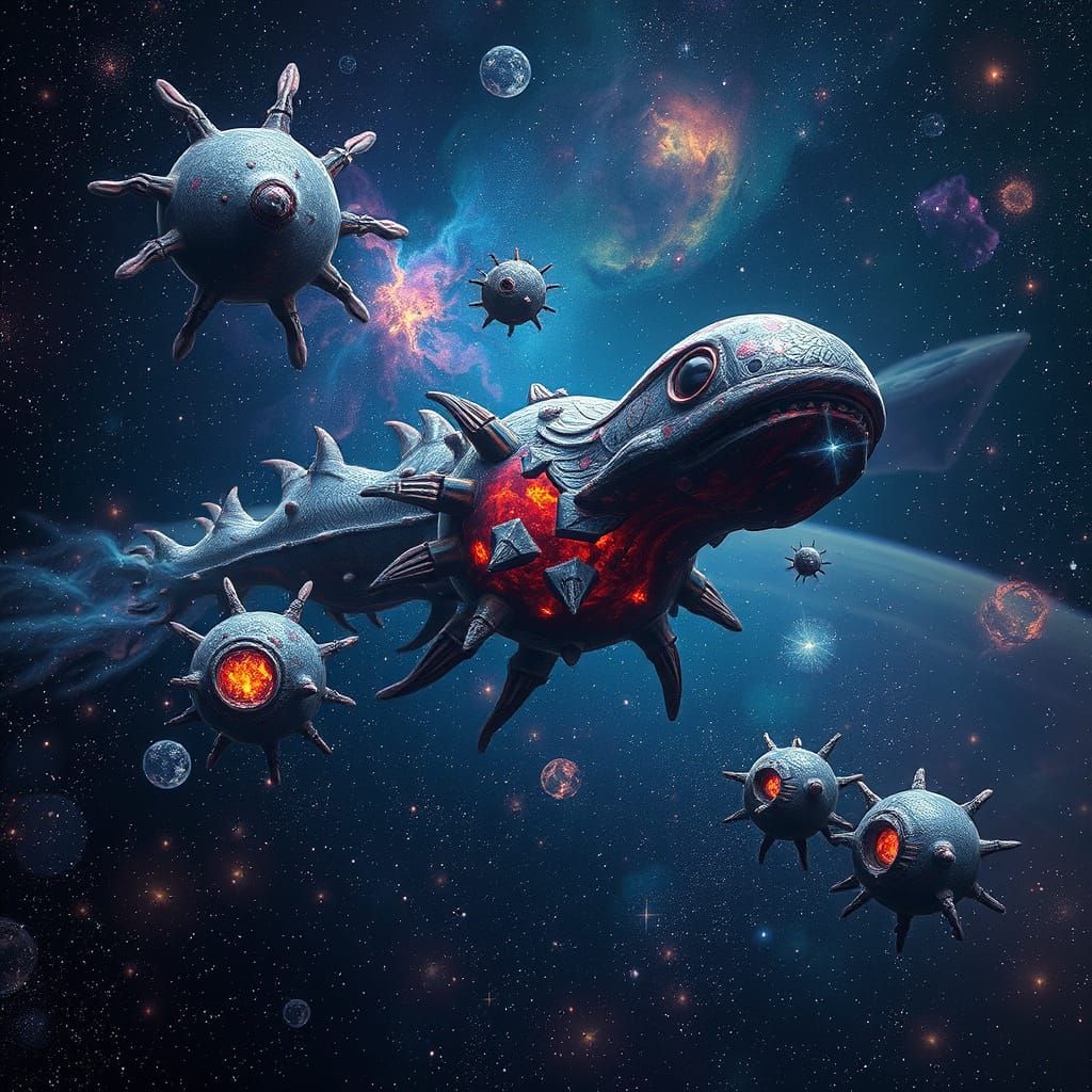 This image is a vibrant, dreamlike depiction of celestial entities suspended in deep space, amidst swirling nebulae and stars, evoking a sense of cosmic wonder and awe, with intricate details and textures reminiscent of visionary art