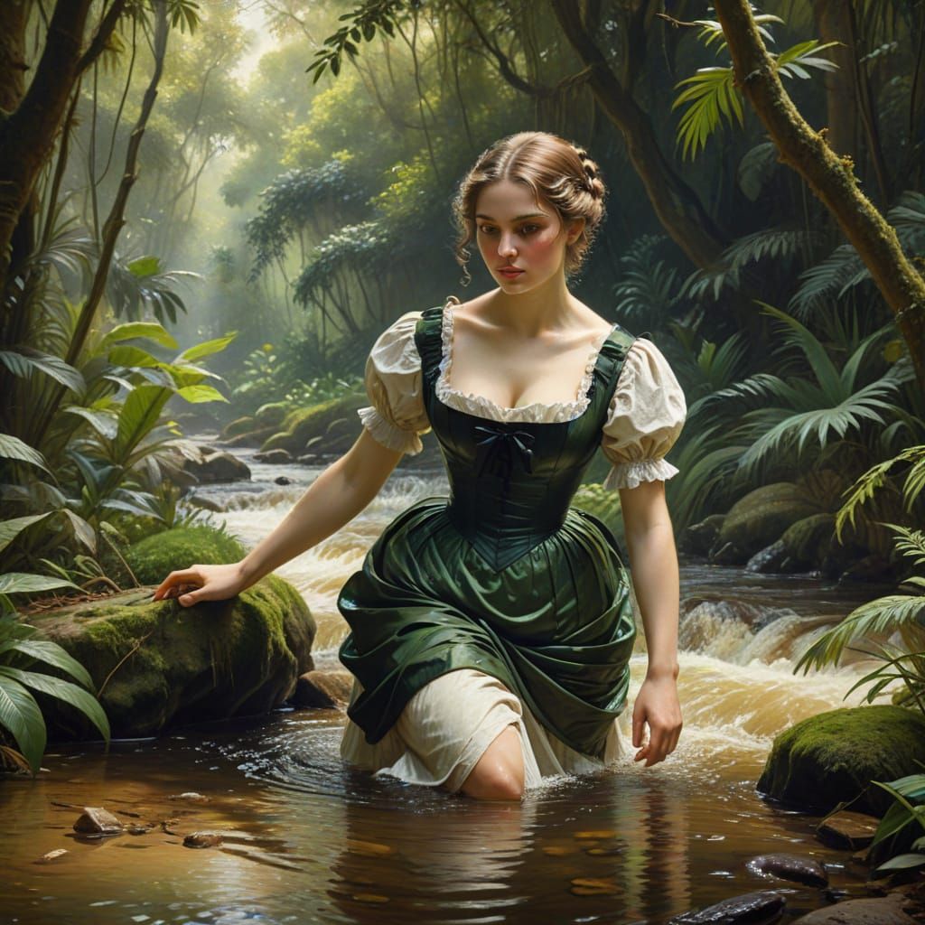 A young viscountess in a white and tan underdress playfully splashes a maid in a sun-dappled jungle stream. Captured in the style of Thomas Couture, this oil painting features rich textures and vibrant greens.