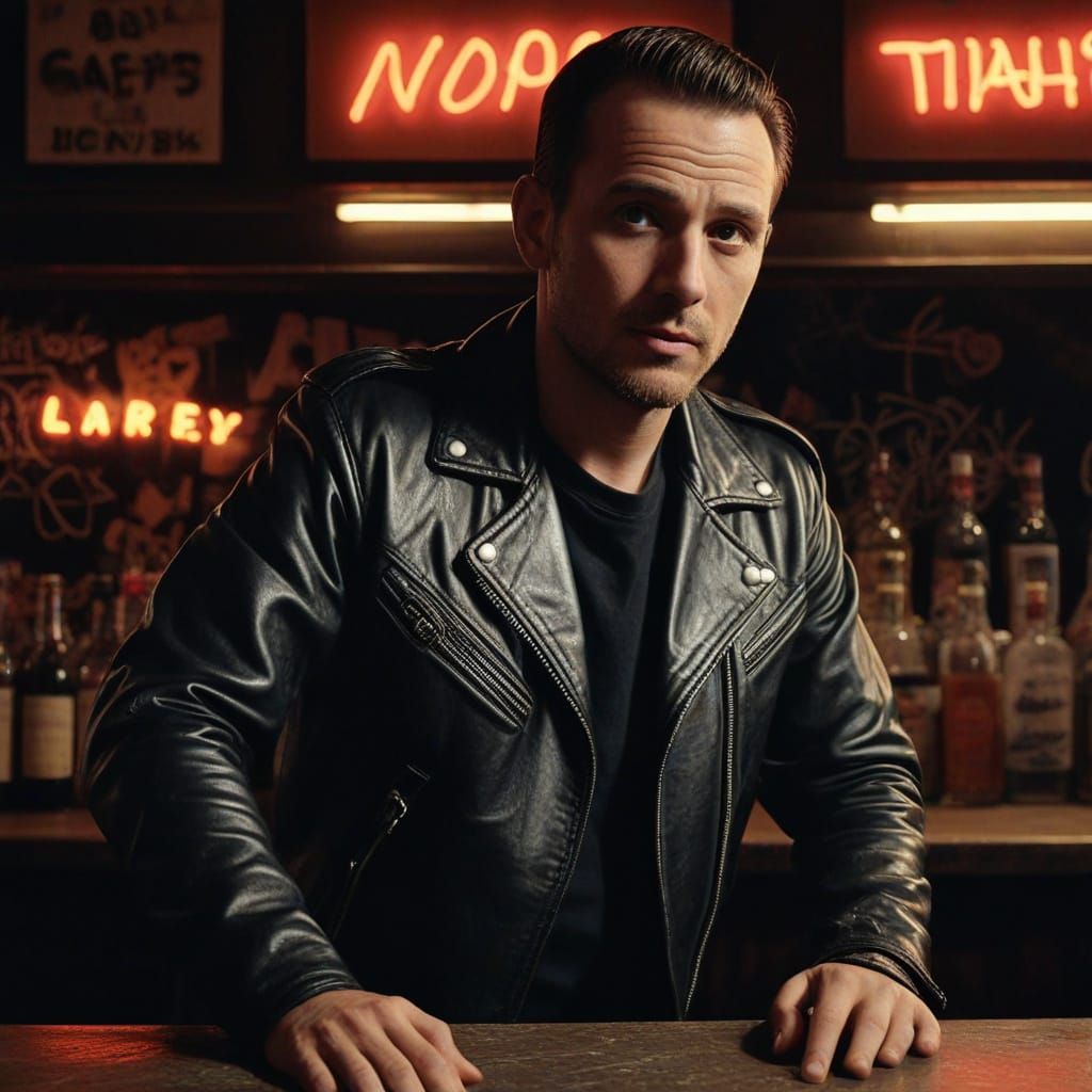 A medium shot of a man in a leather jacket at a roadside bar, reminiscent of Dadaist street art. Graffiti, neon reflections, and vibrant colors create a cinematic, edgy scene.