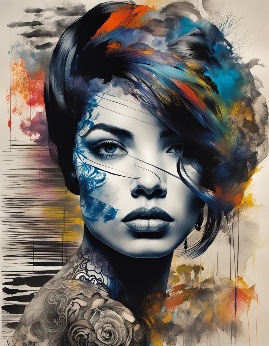 This image shows a portrait of a woman that combines graphic and elegant imagery. Delicate, colorful acrylic lines illustrate beauty while hinting at fragility and hidden emotions in mixed media.