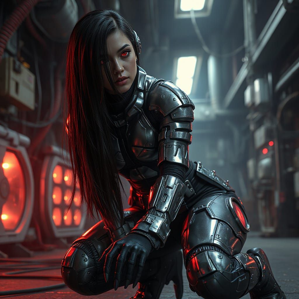 This image shows a cyberpunk woman with cybernetic enhancements crouching in a futuristic laboratory. The scene features metallic armor, glowing red eyes, and a dark, eerie atmosphere with detailed textures.