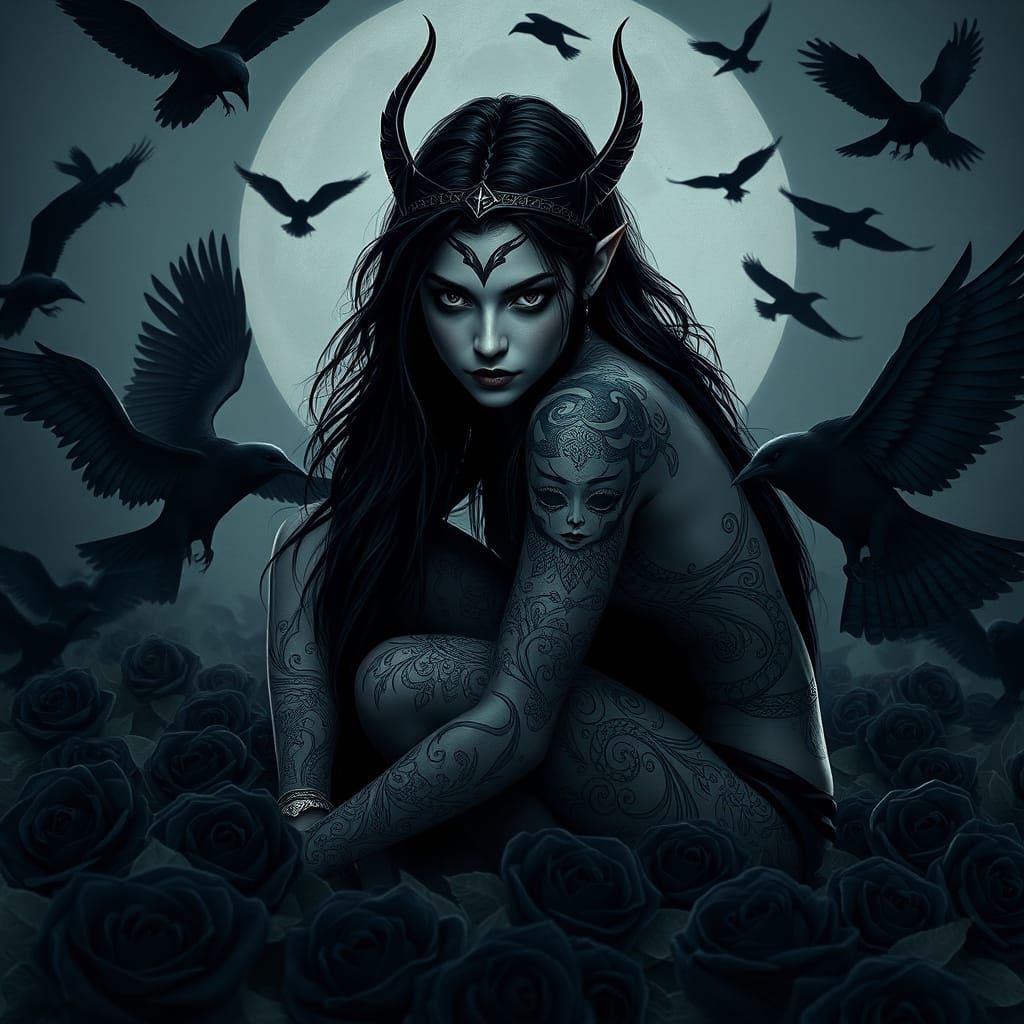 A haunting portrait of a dark elf femme fatale, embodying the war goddess Morrigan, amidst intricate tattoos and silhouetted ravens in a dark, gothic landscape, evoking ancient Celtic mysticism and blending ukiyo-e art with high-tech sheen.