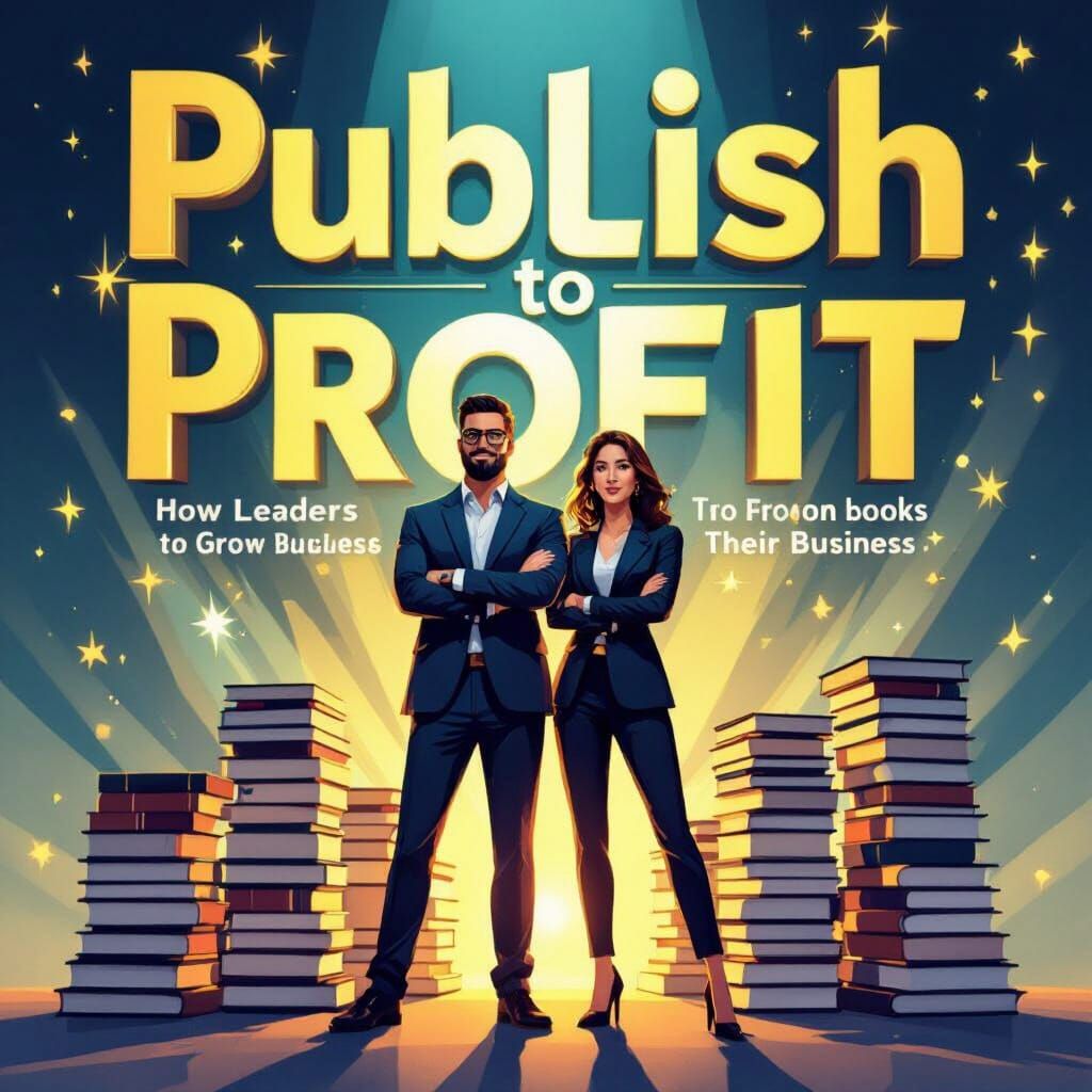 A vibrant digital artwork shows a man and woman with book stacks. Golden accents and dynamic lighting suggest success and business growth in a modern graphic style.