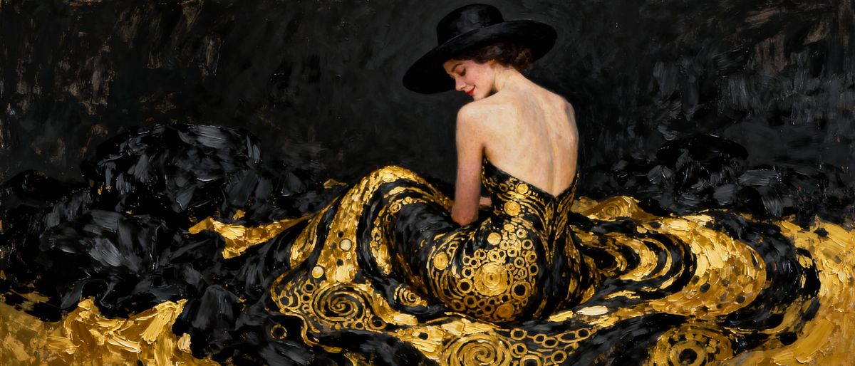 This image shows a woman from behind, wearing a black hat and a subtle smile. She is seated amidst black and gold elements, with a swirling dress featuring intricate golden patterns in an impasto style.