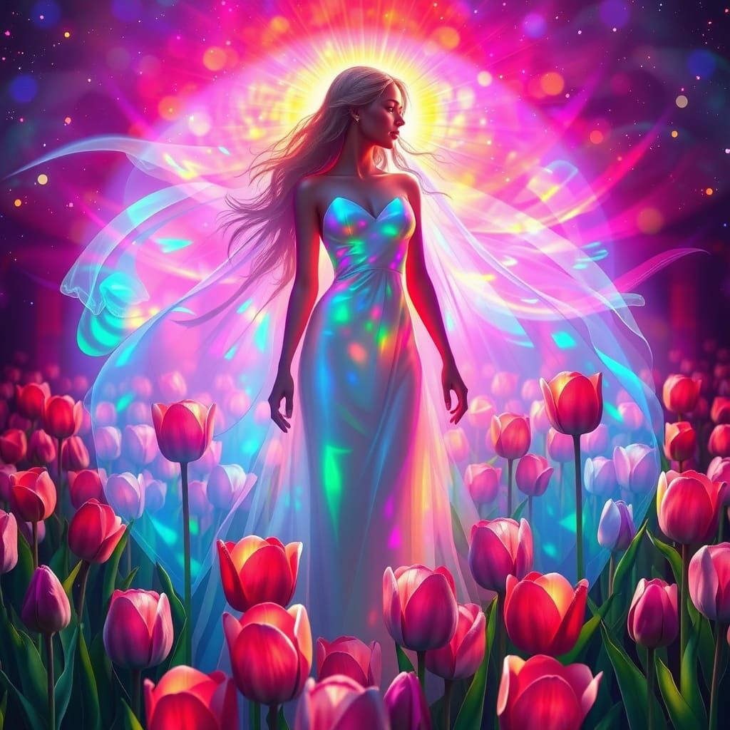 This vibrant, iridescent artwork features a woman in shimmering opal, surrounded by a kaleidoscope of colors and energy lines, reminiscent of Klimt and Japanese art