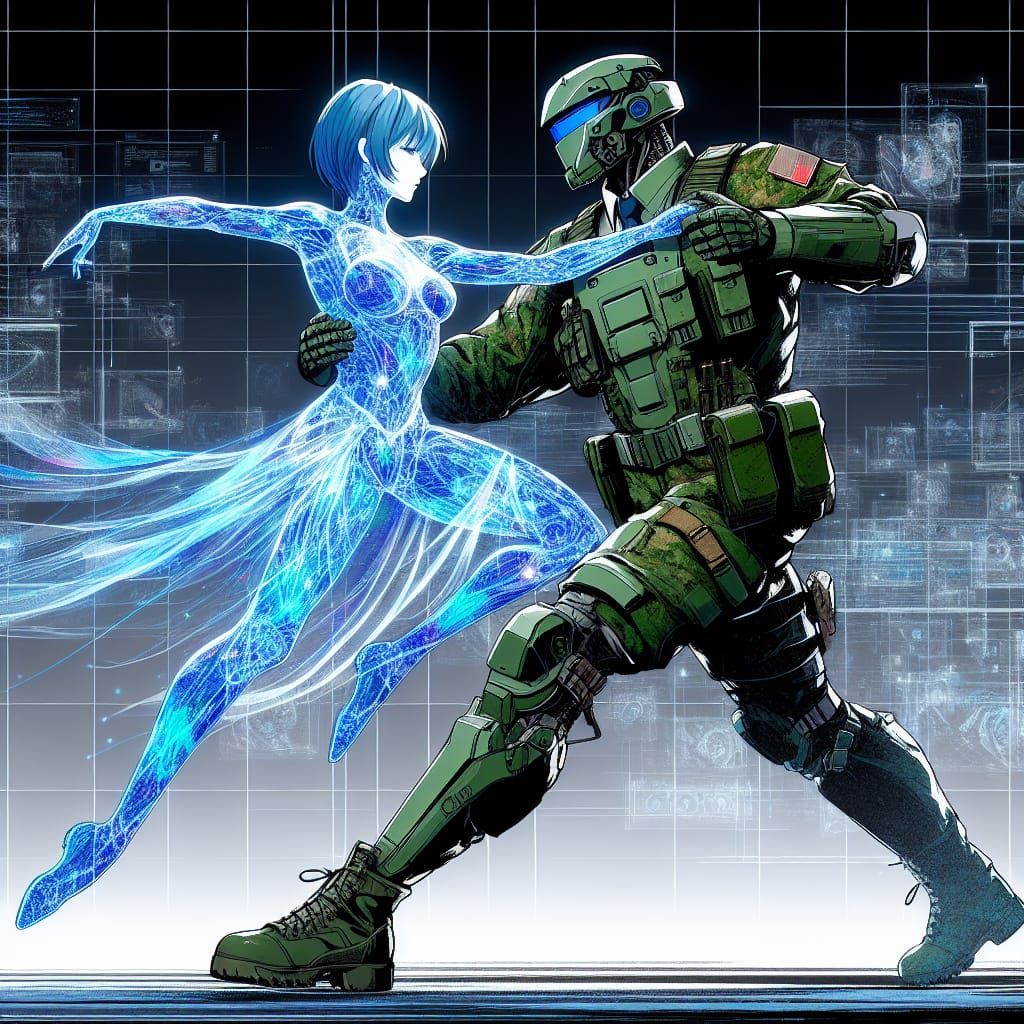 This image shows a soldier in green armor waltzing with a holographic woman made of blue light. The scene blends digital and physical elements in a manga and anime style.