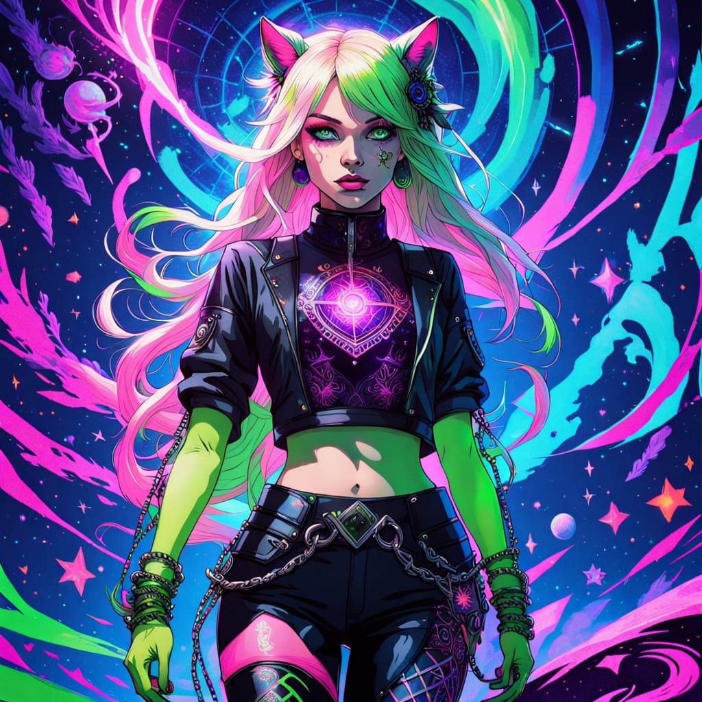 This captivating image features a hyperrealistic catgirl in a striking gothic outfit, adorned with intricate tattoos and a glowing pendant. Her vibrant heterochromic eyes and cosmic backdrop create an otherworldly aura.