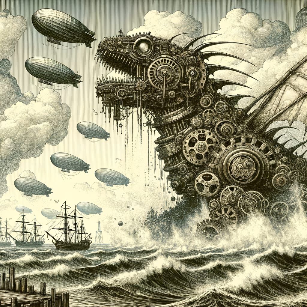 A colossal, mechanical sea monster with gears and brass plating emerges from a turbulent, oily ocean beneath a sky filled with airships. Rendered in a detailed, rough style evoking early 20th-century fantasy.