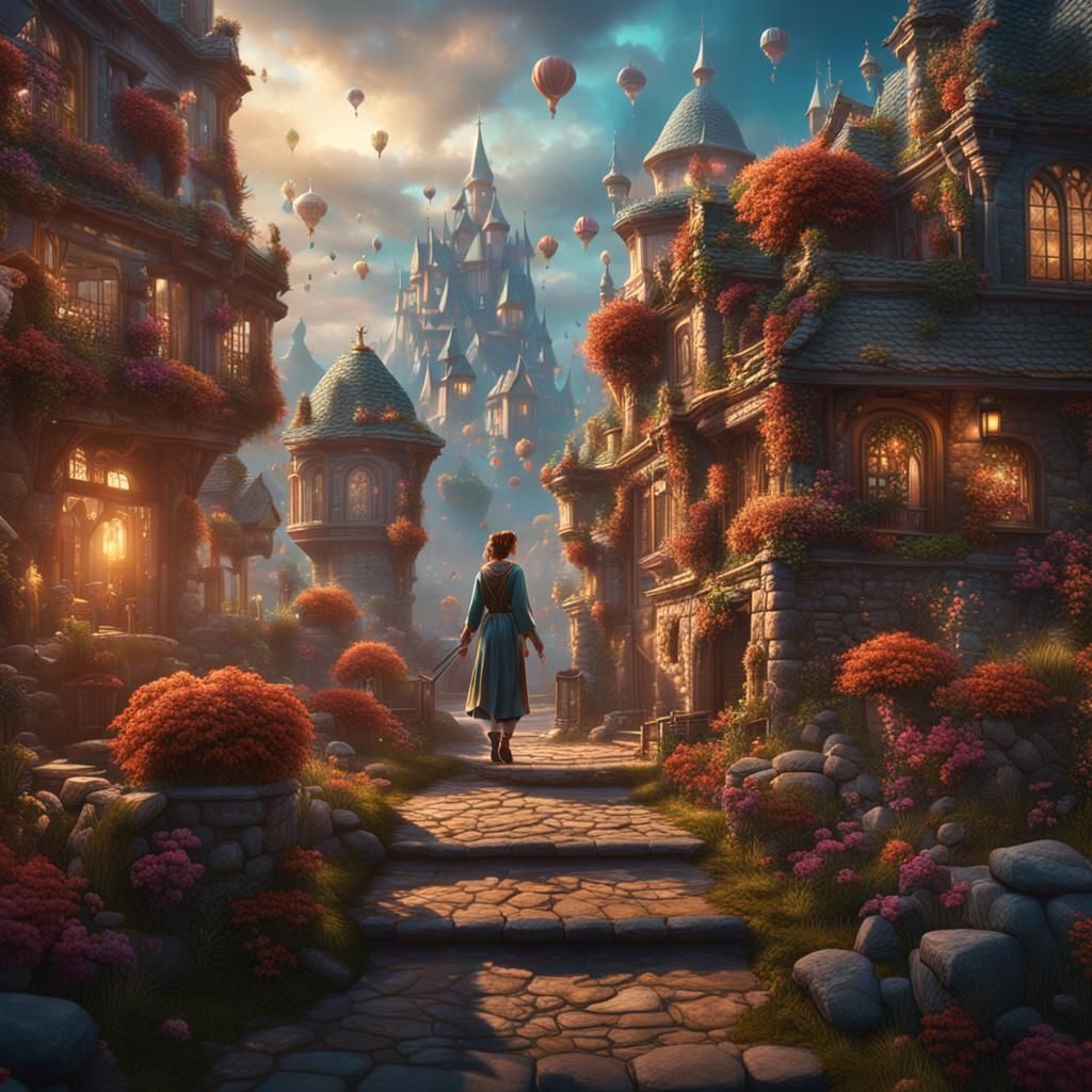 This image shows a happy woman in a vibrant matte painting with intricate details. It features deep, complementary colors and a fantastical aesthetic reminiscent of fantasy concept art.