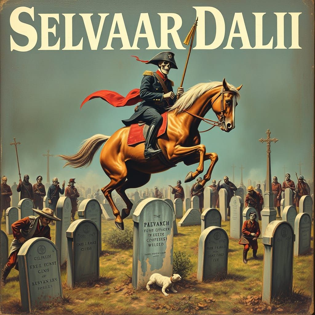 This image shows a vintage magazine cover featuring a skeletal Confederate general on horseback leaping over tombstones as mourners look on in horror, rendered as a surreal, melting oil painting.
