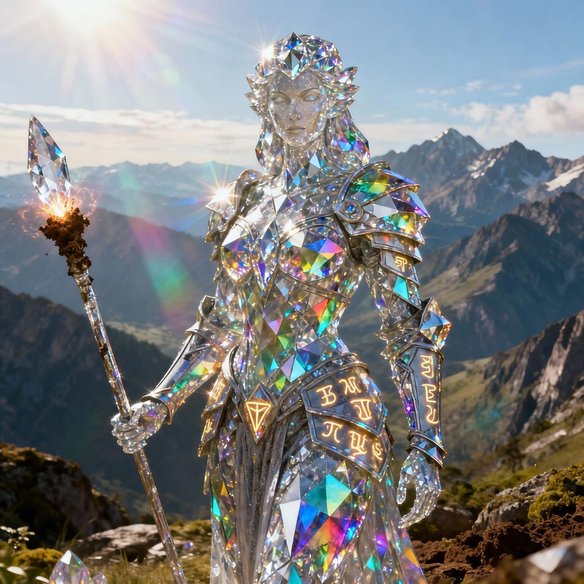 This image shows a majestic female earth elemental sculpted from diamonds, refracting light into rainbows. She wears ornate diamond armor and holds a crystal spear, embodying earth's strength. Cinematic lighting enhances the fantasy concept art.