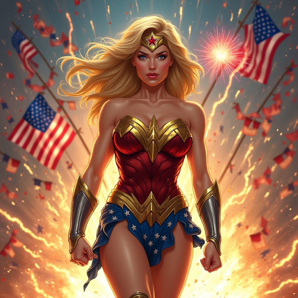 A dynamic image of Wonder Woman surrounded by fireworks and American flags. This image captures a patriotic scene with bold lines and vibrant colors, in a comic book art style.