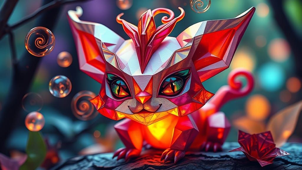 This digital painting showcases a whimsical forest creature made from fire, glass, and other materials, with shimmering magical swirls and orbs in the air. Created with ultra-detailed and high-quality techniques, the artwork features colorful glasswork in the background.