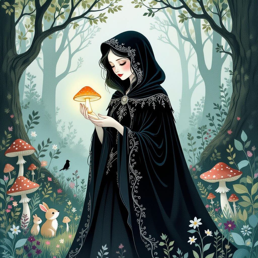 A gothic woman in velvet and silver stands in a whimsical forest holding a glowing mushroom. This image is rendered in a charming children's book art style with soft brushstrokes and a muted palette.