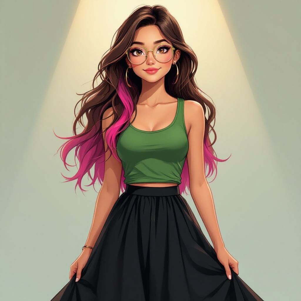 A vibrant image of a 17-year-old girl on stage. She has long brown hair with pink streaks and is wearing a green tank top and black skirt. The artwork is optimistic, playful, and reminiscent of hand-drawn textures.