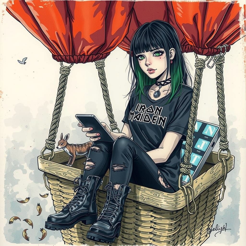 A striking picture of a young woman with black and green hair sitting in a hot air balloon. She is wearing an Iron Maiden t-shirt, fishnet top and combat boots, rendered as a hyperdetailed charcoal drawing.