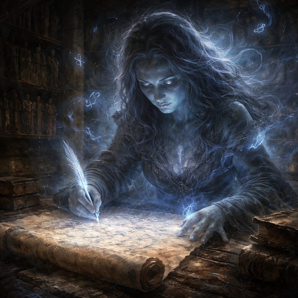 This image shows a translucent woman concentrating on an ancient, glowing scroll in a forgotten library. Arcane symbols float around her. The style is dark fantasy concept art with a dreamlike, lo-fi feel.