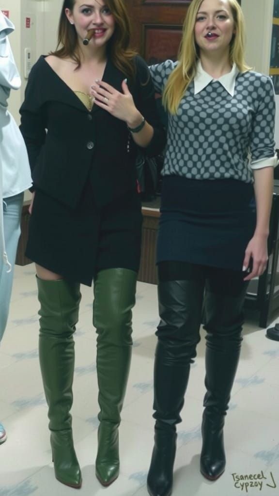 A striking picture of Emma and Nicky in elegant outfits and thigh-high boots, smoking cigars. The image evokes a noir aesthetic with cinematic, high-contrast elements.