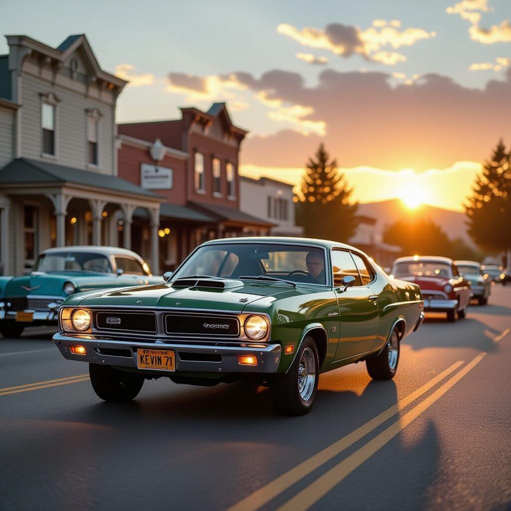 This image shows a classic 1971 Dodge Demon speeding through a small town at sunset. The car is painted sublime green and surrounded by other vintage vehicles, depicted in photorealistic style with warm lighting.