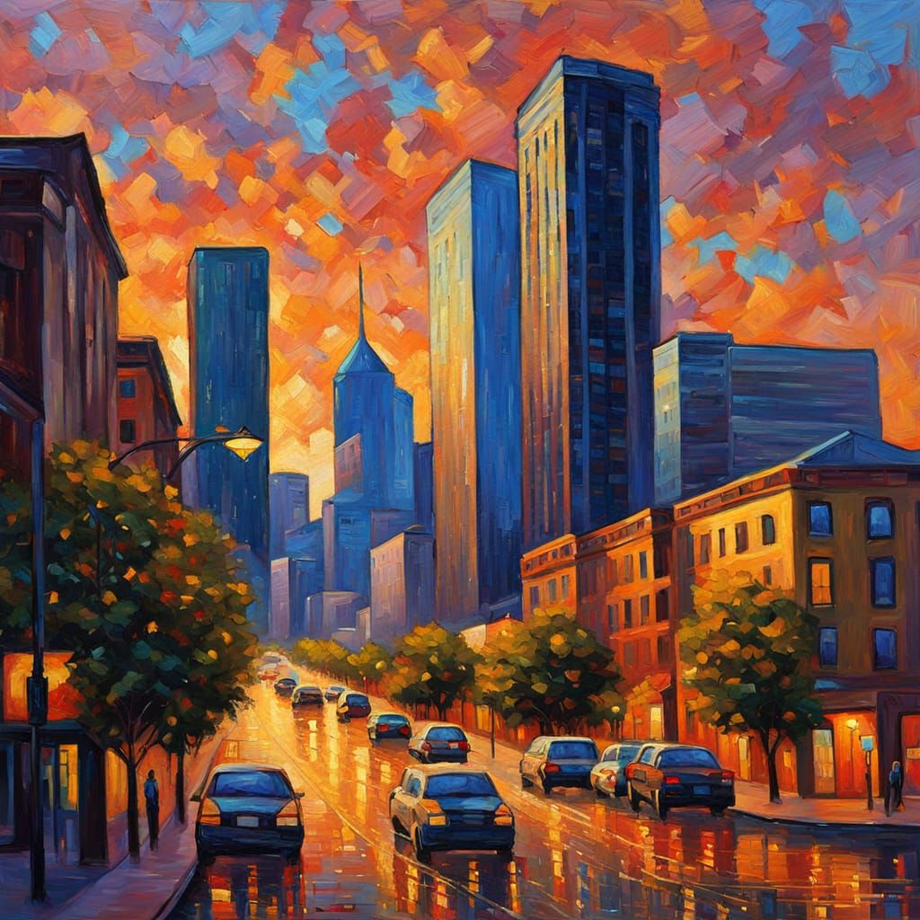 A vibrant cityscape of Dallas at sunset, captured in an expressionist oil painting style with thick, textured brushstrokes and warm golden light.