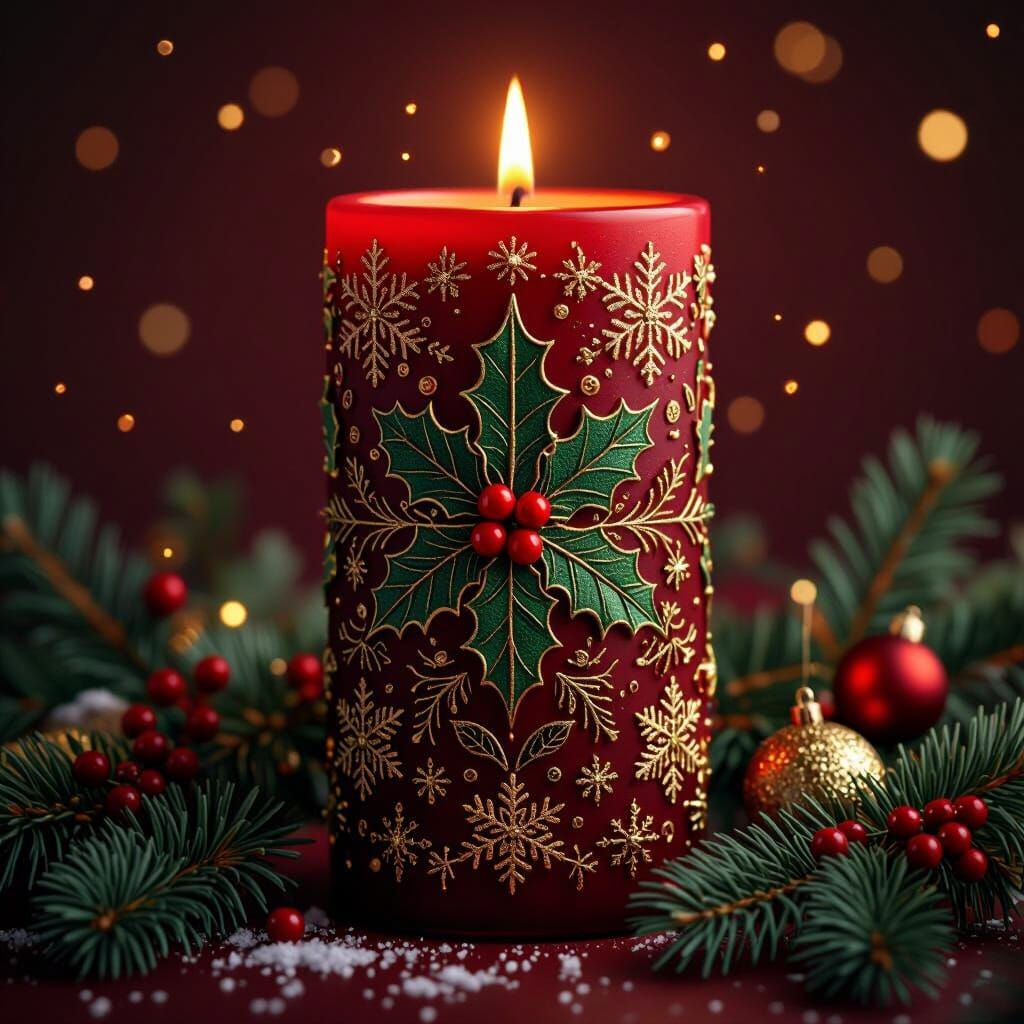 A festive Christmas candle featuring holly, snowflakes and vibrant designs. This highly detailed matte painting with emerald green and gold accents evokes fantasy concept art.