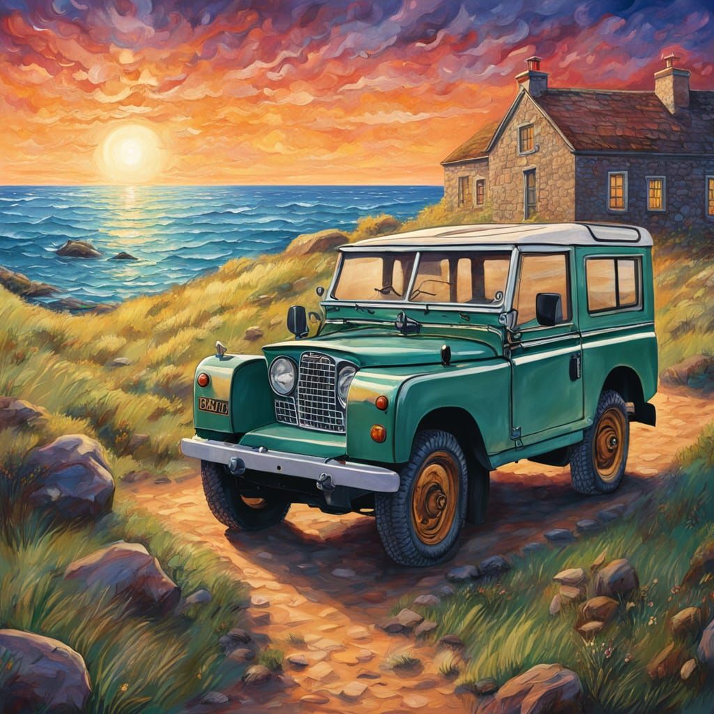 This image shows a vintage Land Rover parked near a stone cottage on a hill. The scene overlooks a beach with a calm sea, rendered with vibrant cosmic colors, astral lights, and golden hour lighting in a mystic realism style.