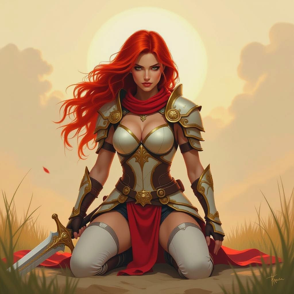 A striking picture of a female warrior with flowing red hair, kneeling with a sword. She wears light beige armor with a red sash, set against a hazy sky in impressionistic style.