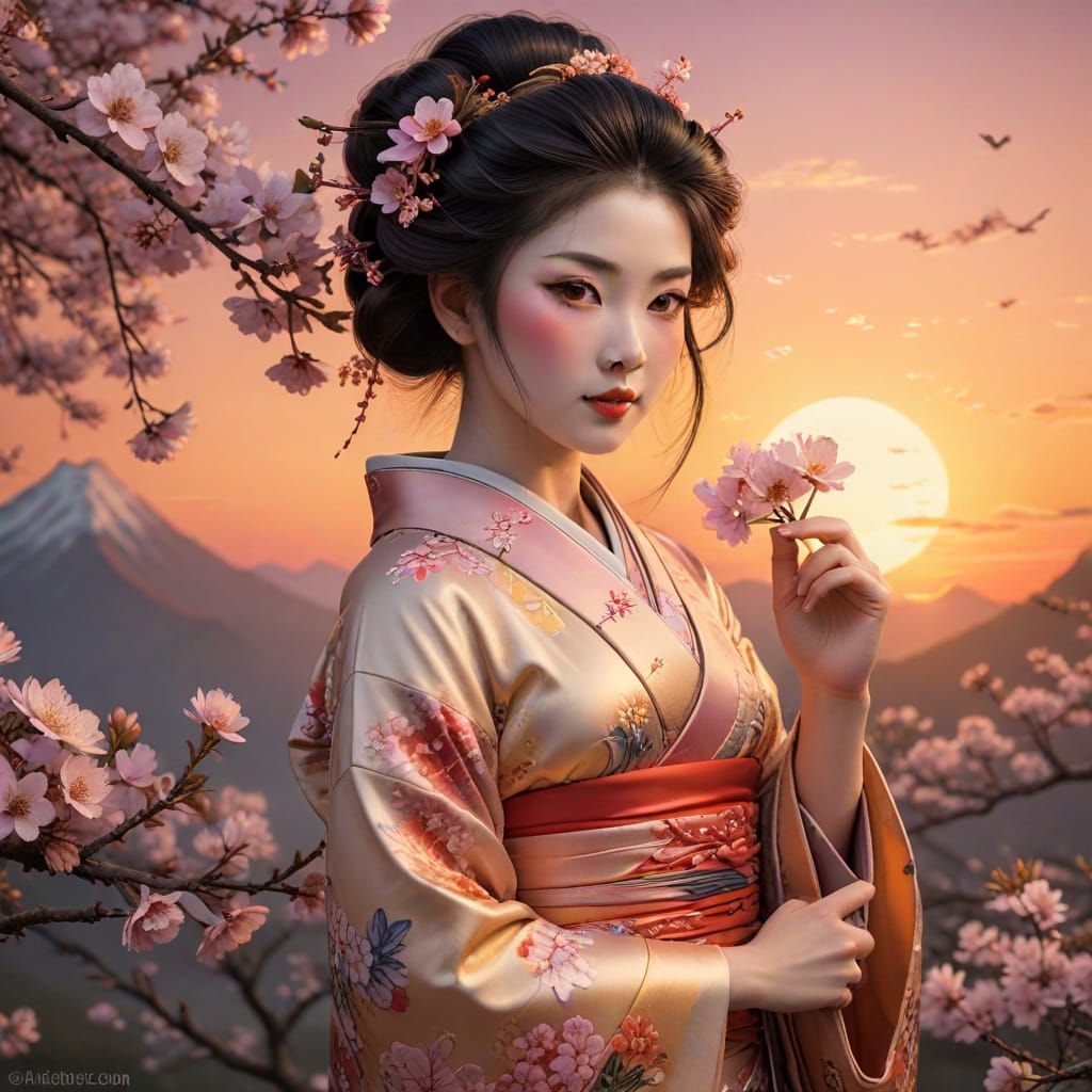 This image shows a geisha holding a cherry blossom. The artwork is highly detailed, with wildflower sunset hues, and has been created as a digital masterpiece.