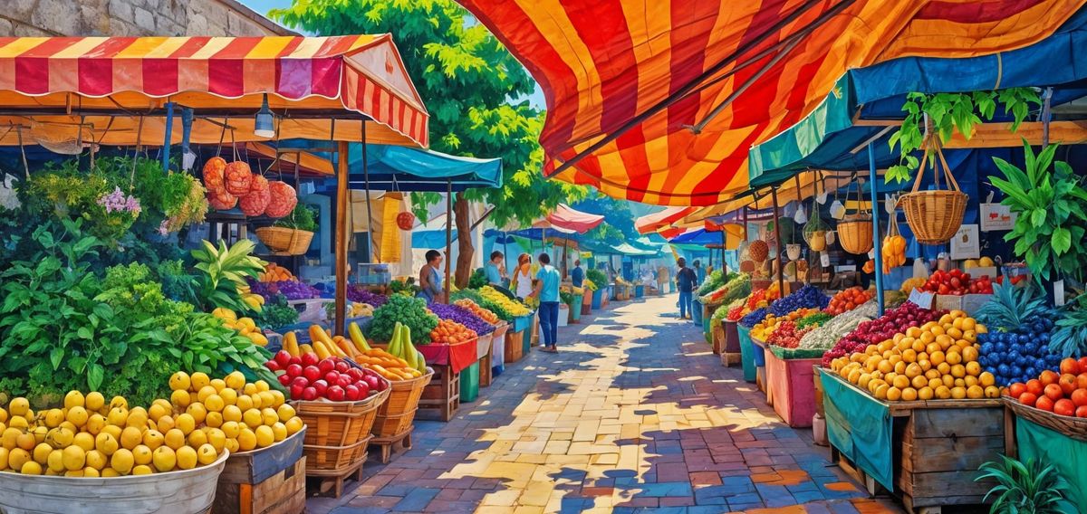 This image depicts a vibrant marketplace filled with fruit and vegetable stands. Colorful shades provide cover from the sun, creating a lively scene.