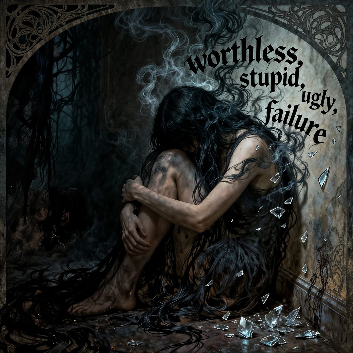 This image depicts a faceless woman in a dark corner, surrounded by swirling words representing inner suffering. The art nouveau style with gothic undertones creates a somber mood.