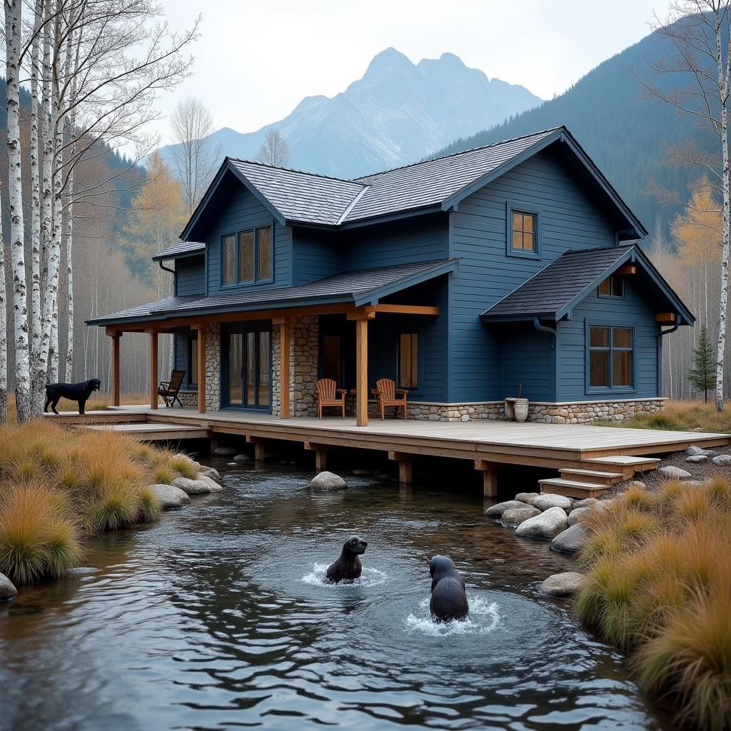 This image shows a navy blue home with a field stone foundation next to a creek with playful otters. A Rottweiler watches over them. The scene is captured with professional bokeh and natural lighting.