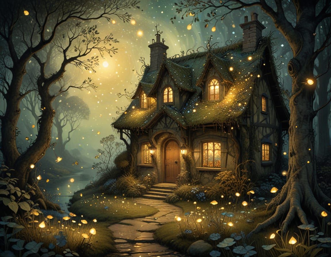 pointillist glimmer Sparkly sequins magic [ A photo luminence cute, A quaint, moss-covered cottage with a thatched roof and smoke drifting from the chimney, nestled deep within an enchanted forest of twisted tree trunks and whispering leaves, bathed in the soft, ethereal glow of twilight, its windows ...