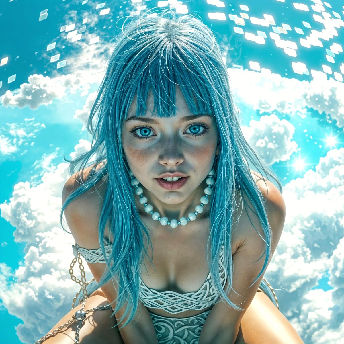 This image showcases a stunning cloud goddess with long, bright blue hair and piercing blue eyes. She wears elegant, intricately designed armor and stands out against a fantastical backdrop, characterized by vibrant colors, detailed textures, and cinematic lighting.