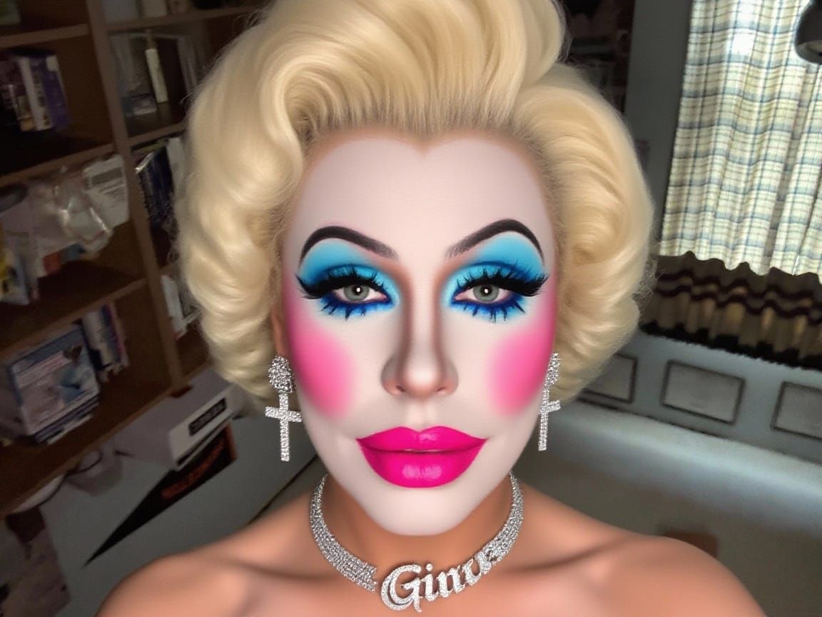 This image features a crossdresser with striking makeup, including pink lips, false eyelashes, and blue eyeshadow. A blonde wig, cross earrings, and a silver necklace complete the glamorous look.