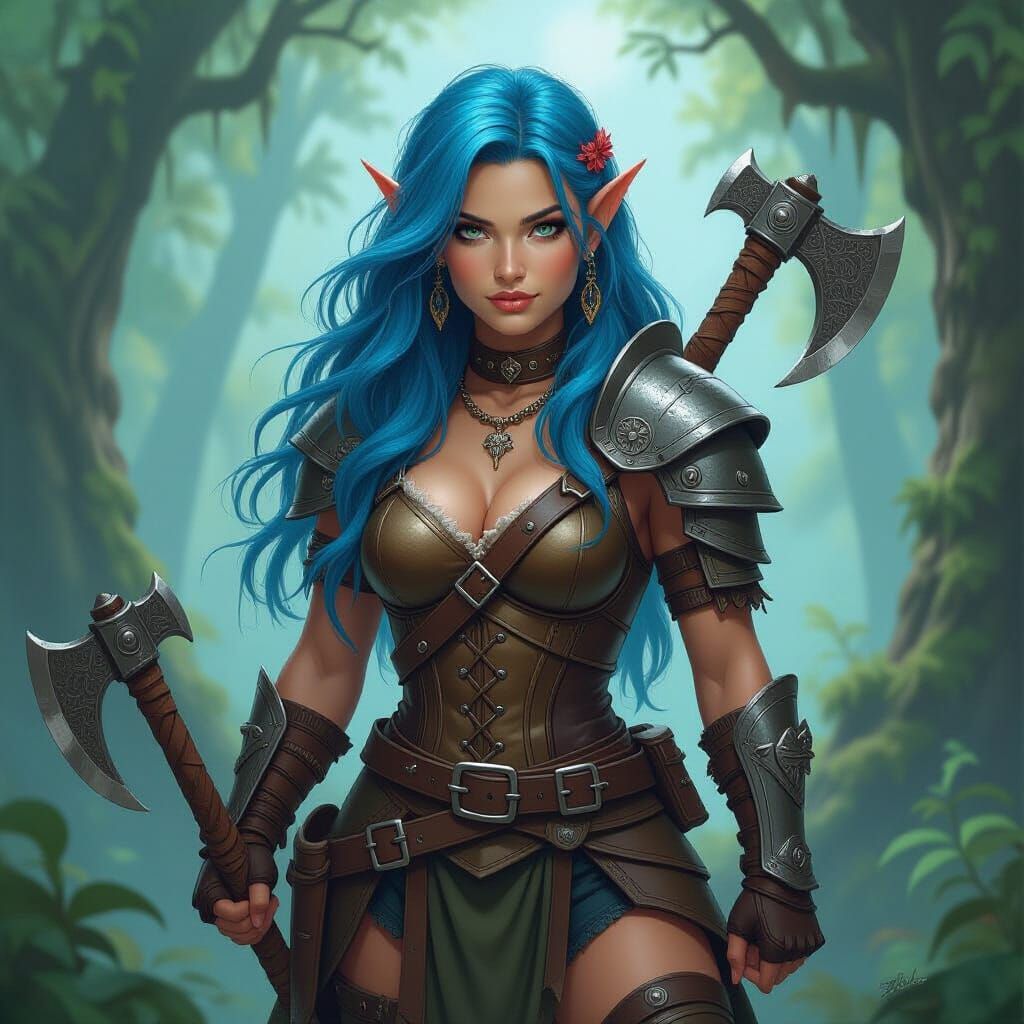 A striking picture of a female dwarf warrior with blue hair in a mystical forest. She is clad in leather armor and carries axes, rendered with intricate detail and earthy tones as fantasy art.