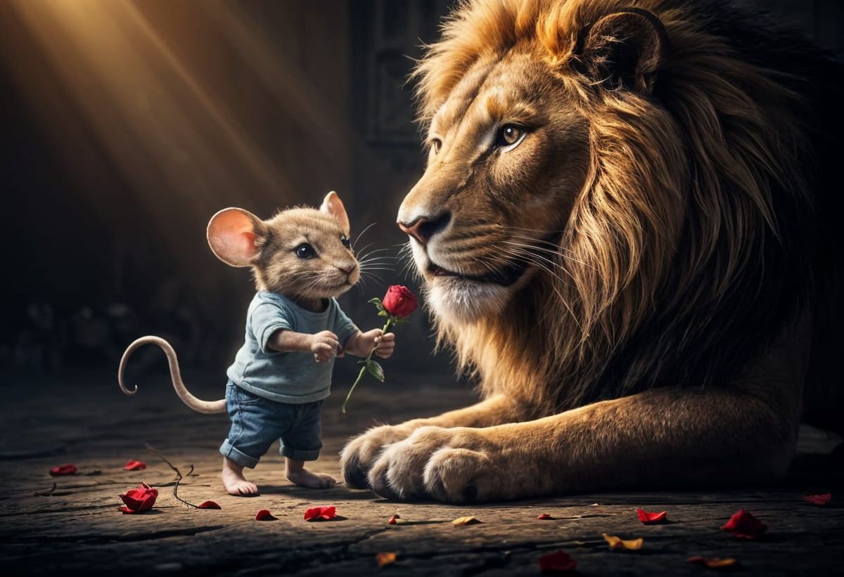 This image shows an anthropomorphic mouse helping a lion with a thorn. Rendered with hyperdetailed CGI, it features dramatic lighting and sharp focus for a lifelike fantasy realism look.