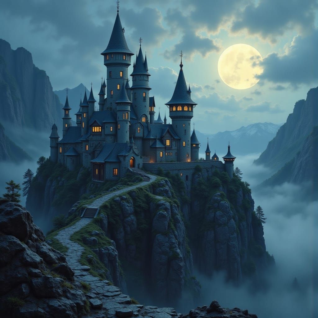 <lora:Minamax:1.0> Majestic magical wizards castle perched on a rocky hill or nestled in misty mountains-towers leaning, glowing windows, strange magical weather overhead. dark fantasy, shadows, dark, digital painting, wallpaper, surrealism, intricately detailed, gouache, by james gilleard and chien ...