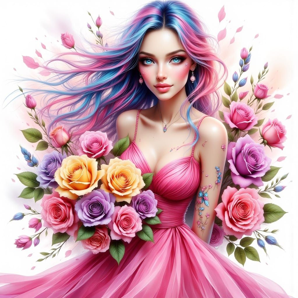 This image shows a woman with stunning rainbow-colored hair, wearing a bright pink dress and surrounded by colorful roses, with a subtle breast cancer awareness theme, created in a whimsical illustration style blending fantastical colors and delicate details.