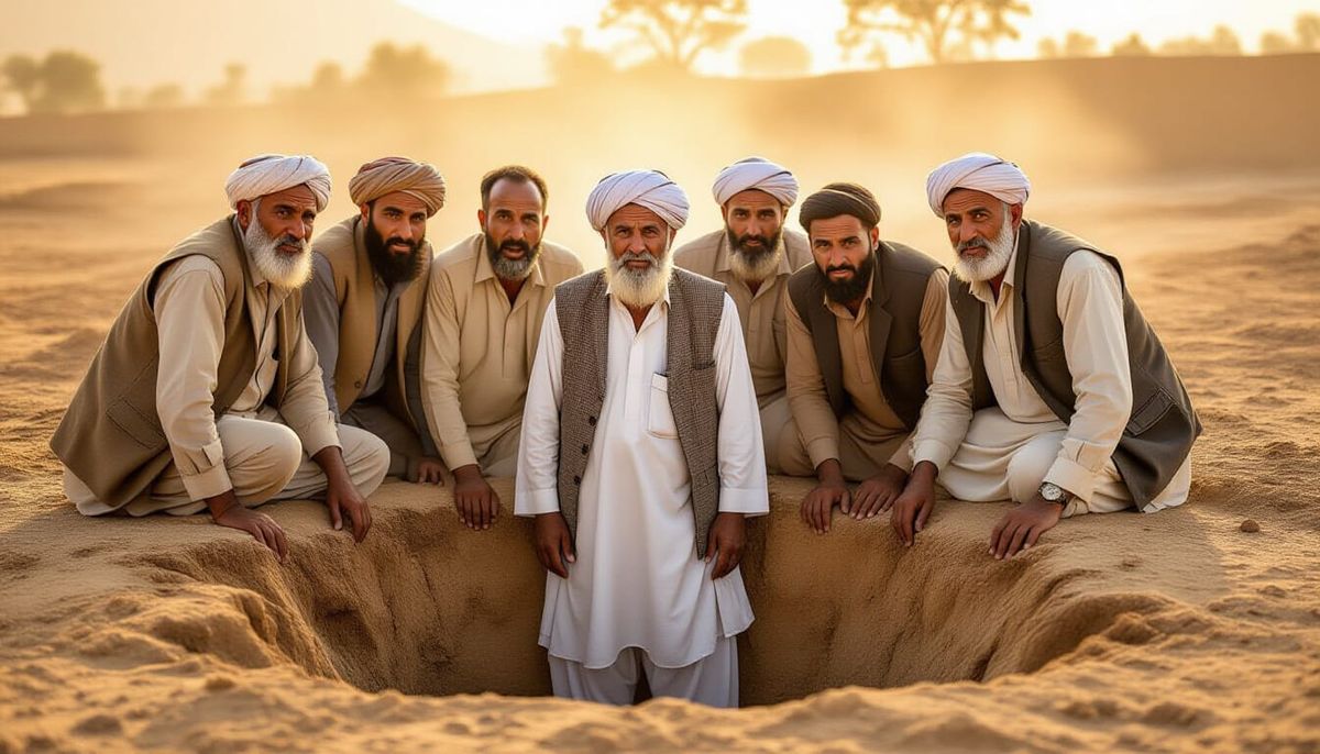 This image shows Muslim villagers gathered around a deep pit, their faces reflecting shock and concern. The scene features warm, golden light and earthy tones, captured in a style reminiscent of emotive documentary photography.