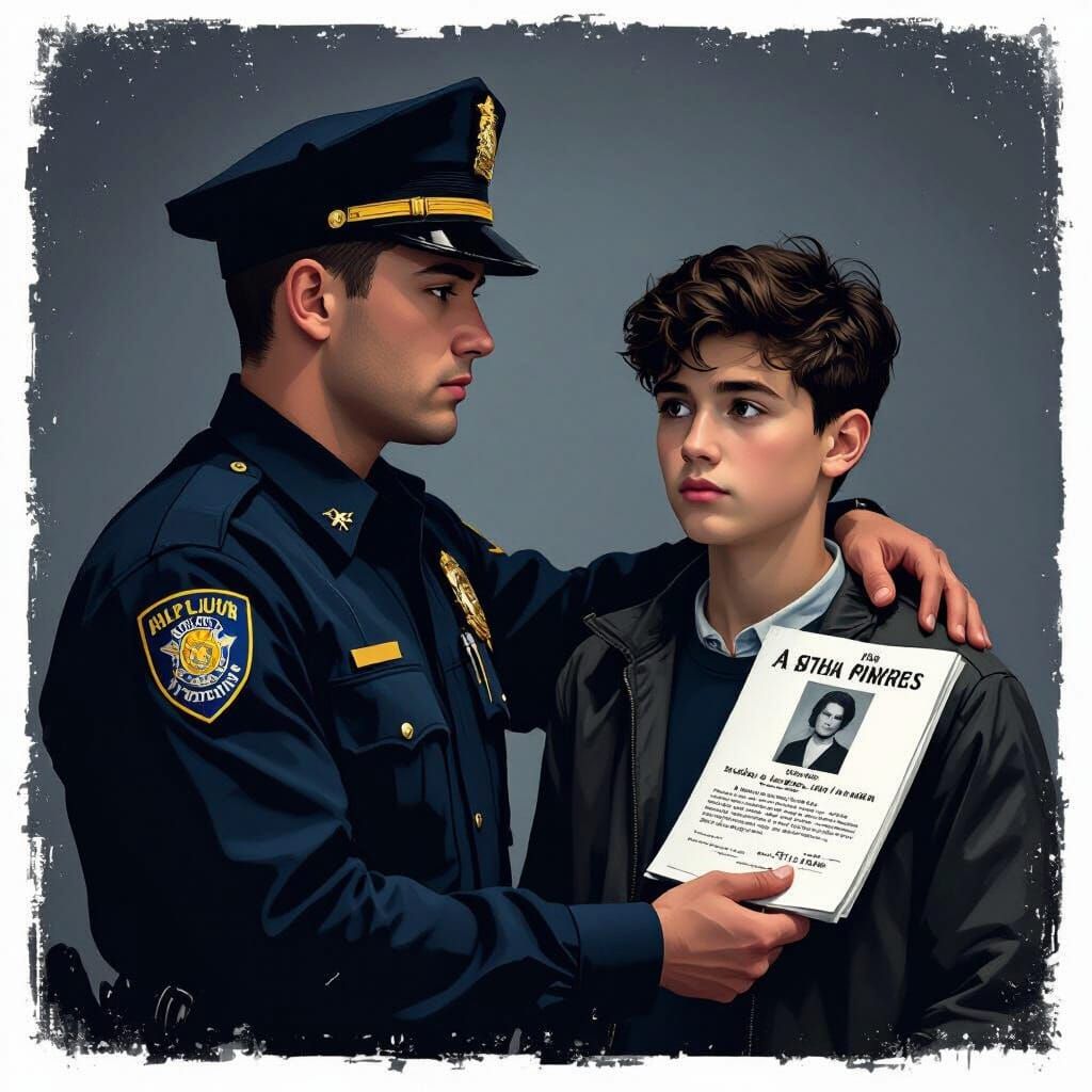 A police officer confronts a teen matching a missing person's poster in a dark, somber waiting room, creating a dramatic and tense scene in a limited color palette with a grim realism.