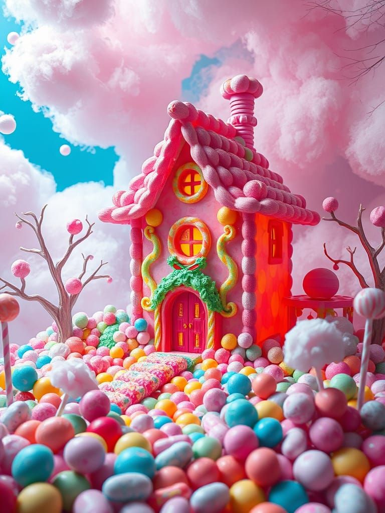 This hyperdetailed fantasy artwork showcases a bizarre candy house amidst a landscape of bonbons and cotton candy. The scene features bright, vibrant colors and meticulous detail.