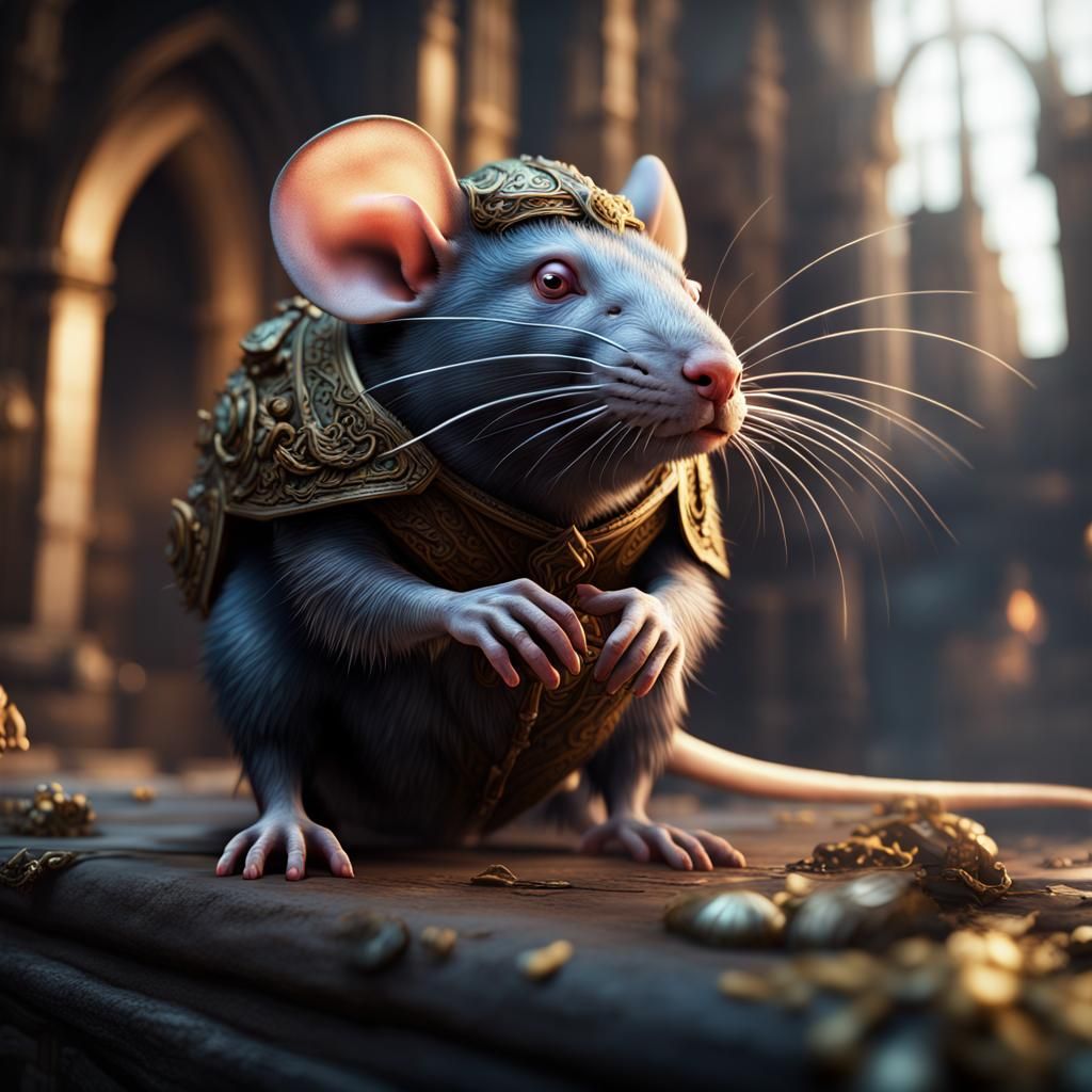 A detailed matte painting of a rat in a fantastical setting. The image features deep colors, intricate details, and complementary color schemes, rendered as fantasy concept art in 8k resolution.