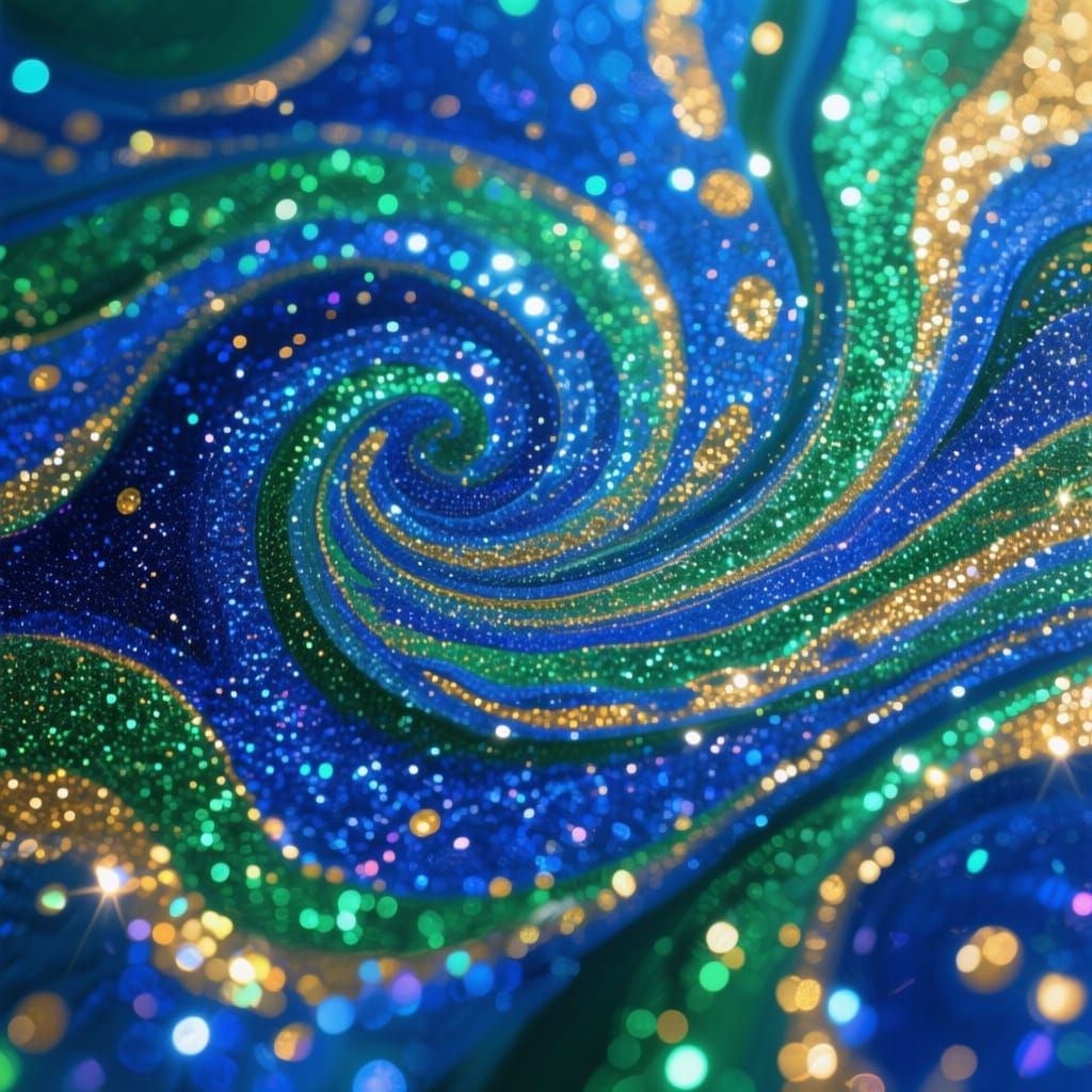 This abstract artwork features a mesmerizing glitter swirl in sapphire blue and emerald green, with gold accents. It evokes cosmic energy with dynamic textures and dramatic lighting.