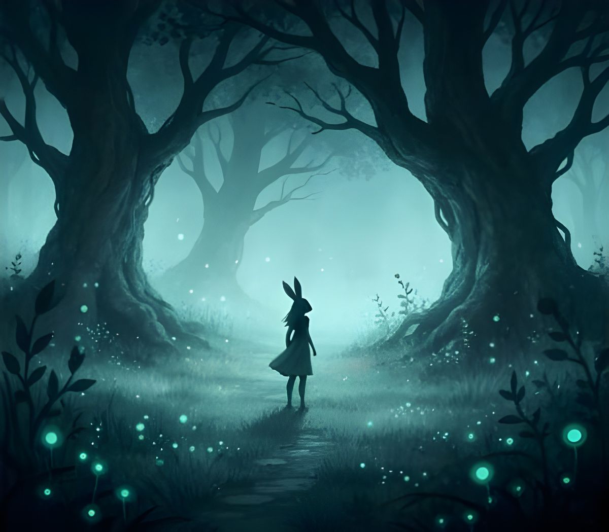 A lone rabbit woman wanders an overgrown, dimly lit garden at midnight, shrouded in mist and faint bioluminescence. Dark fantasy concept art with soft watercolor textures creates an ethereal, dreamlike mood.