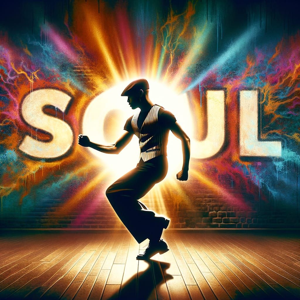 This image captures a lone male Northern Soul dancer in a striking silhouette, set against a brilliant graffiti backdrop that spells out 'SOUL' and casts a halo of light. The scene blends vintage soul with contemporary street art, exuding timeless energy and emotion.
